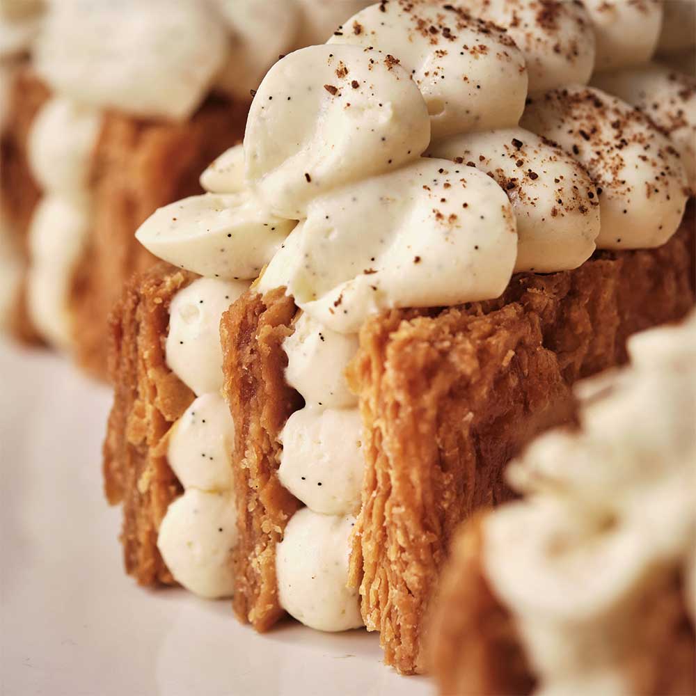 Puff pastry made with French T55 and T80 flour and small spelt from Moulin Viron and Charentes-Poitou DPO butter. Vanilla diplomat cream*. Homemade caramel with butter and fleur de sel. Vanilla Chantilly cream*. Homemade vanilla powder*. *From Madagascar.