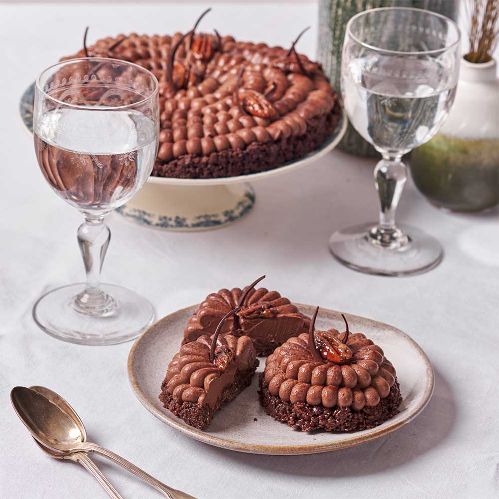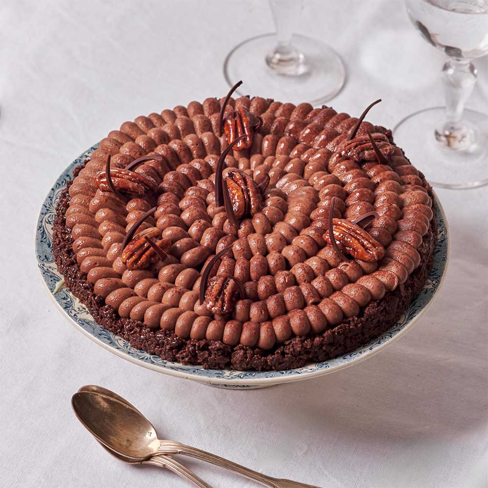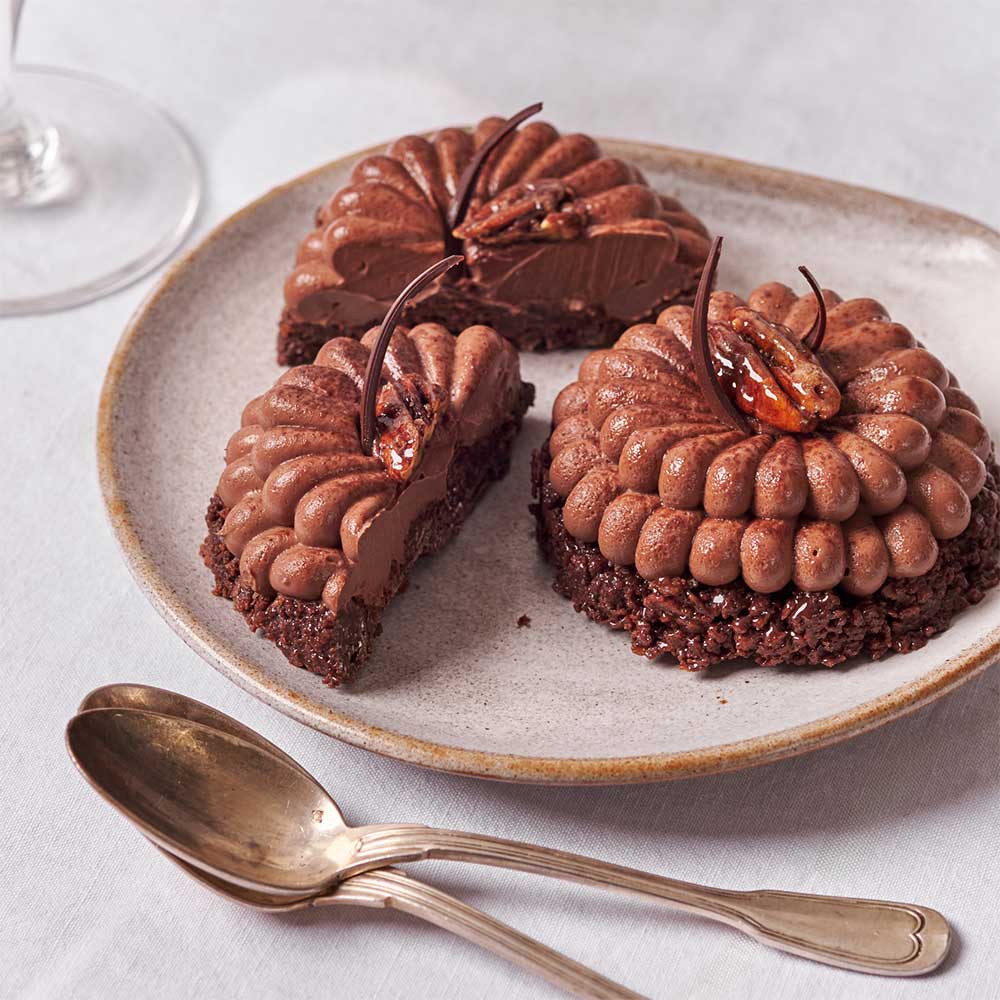 Chocolate shortbread crunchy with PDO butter, cocoa, crispy feuillantine and fleur de sel. Crémeux chocolate. Caramelized pecans. Chocolate decoration for an airy touch.