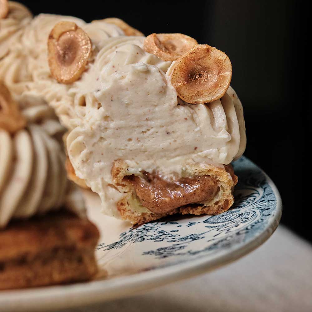 Délicate pâtisserie à partager, ce grand classique se distingue par ses lignes élégantes façonnées par le geste du pâtissier et ses saveurs franches. Dans la pure tradition, la texture friable, délicieusement beurrée du feuilletage s’accorde à la perfection avec la couronne de choux caramélisés, le goût de la vanille, la rondeur de crème pâtissière et la légèreté de la Chantilly.