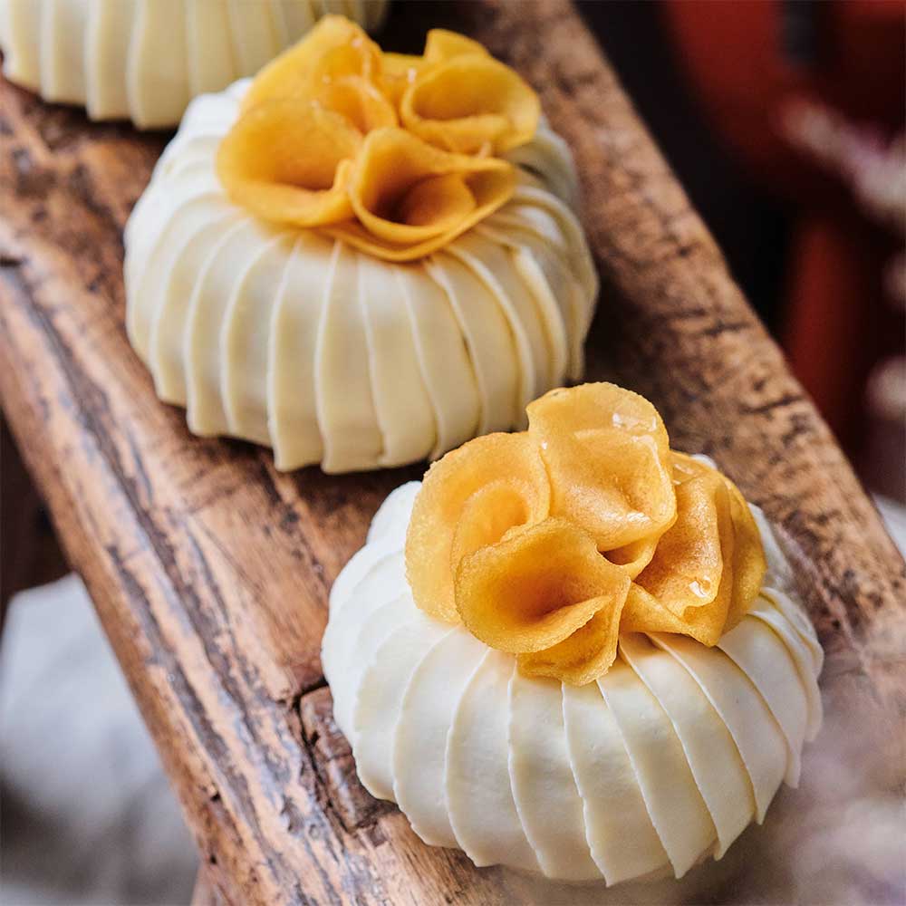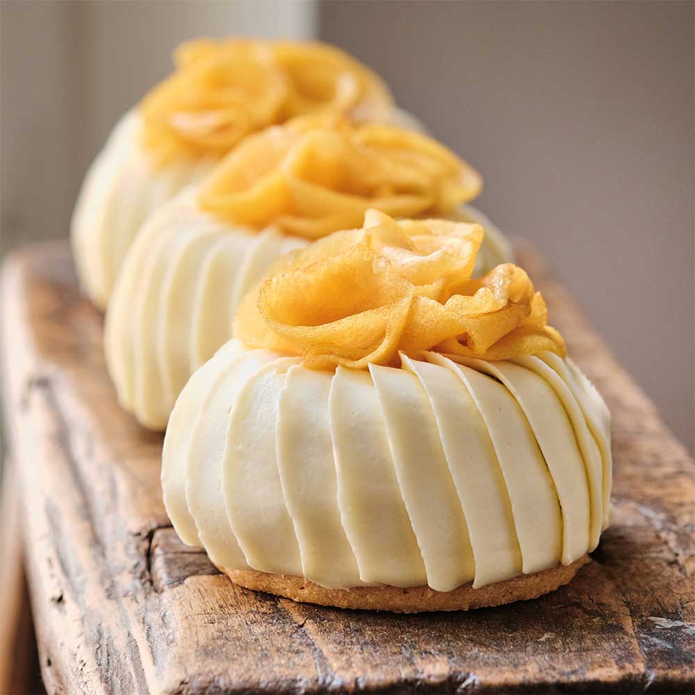 Cette création réunit dans un élégant entremets individuel tous nos souvenirs gourmands autour de la pomme. La brunoise de fruit cru apporte de la fraîcheur à la compotée. La ganache montée à la vanille qui l’enrobe ainsi les pétales caramélisés délicatement dressés évoquent la gourmandise d’une Tatin traditionnellement servie avec une quenelle de crème crue.