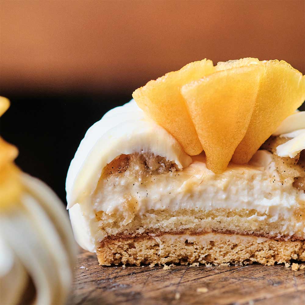 Sablé croustillant à la farine française Moulins Viron et au beurre AOP*. Biscuit Madeleine moelleux au beurre noisette AOP*. Crémeux à la fève de tonka. Pommes cuites en compotée et brunoise de pomme crue. Ganache montée à la crème épaisse et vanille de Madagascar. Lamelles de pommes fondantes caramélisées. *Charentes-Poitou.