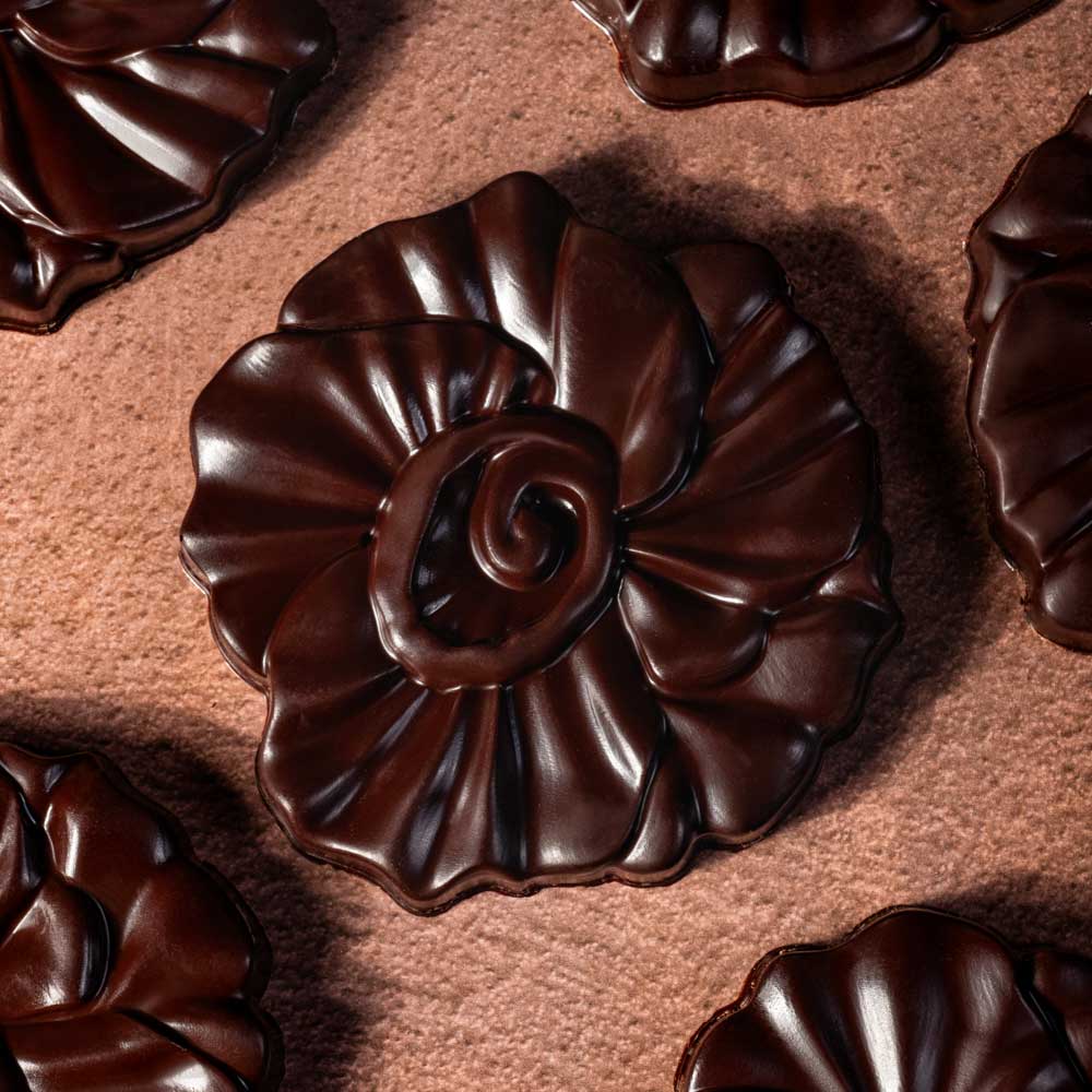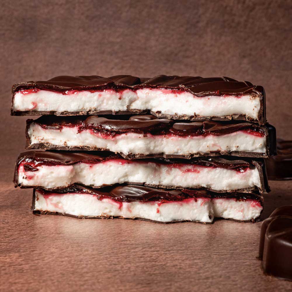 Une douceur irrésistible avec sa fine coque en chocolat noir qui apporte de la profondeur à cette exquise guimauve, tout en tendresse et générosité, qui fait chavirer les sens quand elle rencontre la vivacité légèrement acidulée de la pâte de fruit à la framboise.