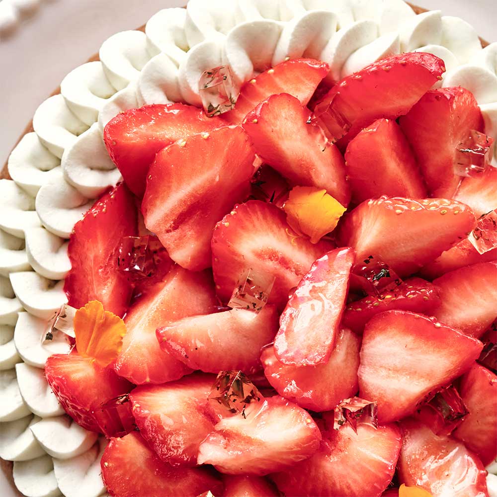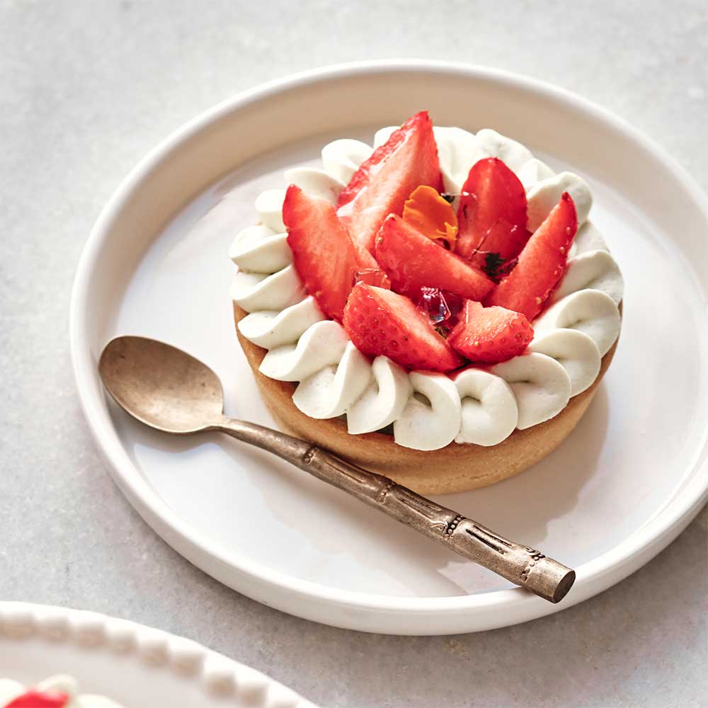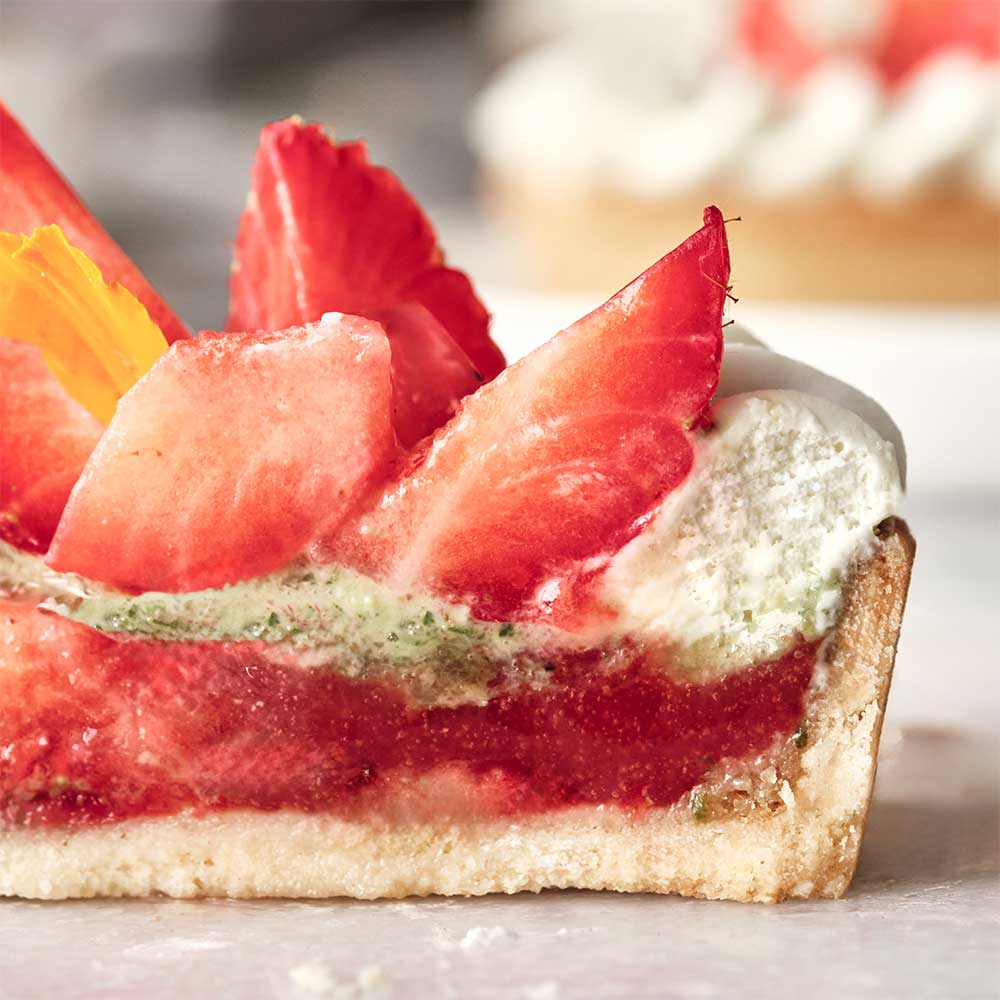 La texture réconfortante de la pâte sucrée délicieusement beurrée. La gourmandise du confit. Les notes délicates d’un pesto aux herbes aromatiques. La rondeur de la Chantilly et la fraîcheur de la menthe : notre tarte qui sublime la saveur des fraises françaises est un concentré de gourmandise qui a le goût des beaux jours !